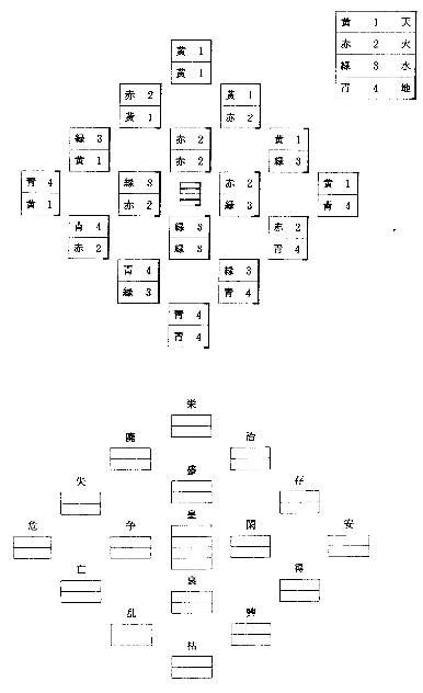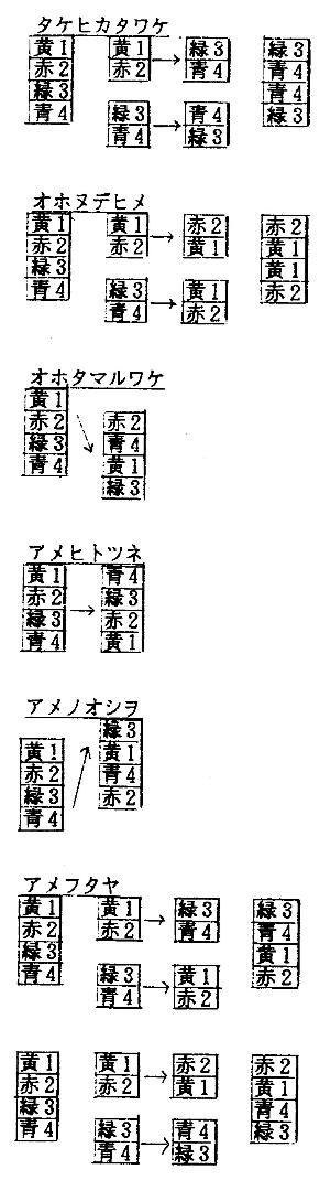 | さて のちに かへります ときに きび の こじま を うみたまふ 然後還坐之時 生吉備見嶋 またの なは たけひかたわけ といふ 亦名謂建日万別 つぎに あづきじま を うみたまふ またのなは おほぬでひめ といふ 次生小豆嶋 亦名謂大野手比賣 つぎに おほしま を うみたまふ またのなは おほたまるわけ といふ 次生大嶋 亦名謂大多麻流別 つぎに ひめしま を うみたまふ またのなは あめひとつね といふ 次生女嶋 亦名謂天一根 つぎに ちかのしま を うみたまふ またのなは あめのおしを といふ 次生知訶嶋 亦名謂天之忍男 つぎに ふたごのしま を うみたまふ またのなは あめふたや といふ 次生倆兒嶋 亦名 謂天倆屋 然後還坐之時 :カヘルとは中心柱の立つオノコロジマに還ることである。 またカヘルとは裏返ったり、跳ね返ったり、引っ繰り返ったりして、 天津金木の位量・順序・状態などが入れちがえになることである。 体系名 霊系名 基本となる中心核1・2・3・4が 吉備兒嶋 タケヒカタワケ 3・4・4・3 小豆嶋 オホヌデヒメ 2・1・1・2 大嶋 オホタマルワケ 2・4・1・3 女嶋 アメヒトツネ 4・3・2・1 知訶嶋 アメノオシラ 3・1・4・2 倆兒嶋(2) アメフタヤ 3・4・1・2 2・1・4・3に変化する。 計7嶋 四柱の中央基準相の組み合わせ総数は256種類あって、その中の代表的なものが上記の7つである。 26-1 天津金木の結合上の用語 〔2柱組の場合〕 (1)表面(上)を裏面(下)に隠すことを「ヒメ」という。 上の柱をヒメするのを「ウエヒメ」という。 下の柱をヒメするのを「シタヒメ」という。 (2)裏面を表面に出すことを「ヒコ」という。 (3)横に置いた天津金木を使用者から見て、向こうへ押し転がして、手前の横側面を表 面に出すことを「オス」という。上の柱をオスのを「ウエオシ」という。 下の柱をオスのを「シタオシ」という。 上柱もオシ、下柱もオシすれば、オシオシであるが、これを「オシヲ」という。 (4)天津金木をこちらへ引き転がして、向こうの側面を表面に出すことを「ヨル」「ヨ リ」という。上柱のコルのを「ウエヨリ」、下柱のコルのを「シタヨリ」という。 上柱もヨリ、下柱もヨリすれば、ヨリヨリであるが、これを「マル」という。 (5)下柱をオシ、上柱を2回文は3回コロがして、表面にすることを「オシコロ」とい う。反対に下柱をコロ、上柱をオスのを「コロオシ」という。 (6)下柱をヨリ、上柱をコロがすのを「ヨリコロ」という。 反対に下柱をコロがし、上柱をコルのを「コロヨリ」という。 (7)上柱をオシて、下柱をヨルのを、換言すれば2柱組の両内側を、割って表面に出す ことを「タケヒ」「タケウケ」「ダグリ」という。 (8)上柱をヨリし、下柱をオシすれば、換言すれば親指と人指し指でつまんで、グッと 内側へ表面を隠し込むようにすることを「オシヨリ」「ウヅメ」「ヌデヒメ」という。 (9)上桂もヒメ、下柱もヒメして、双方を同時にヒメすることを「オホゲツヒメ」とい う。 26-1一@ |